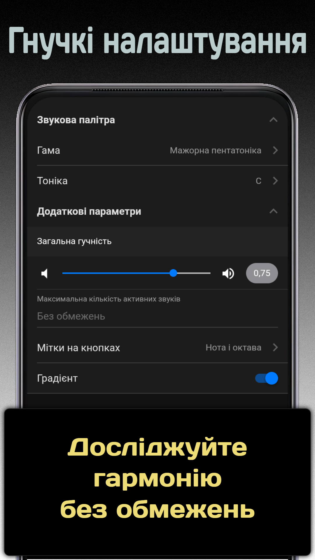 Інтуїтивний інтерфейс робить створення гармонійної музики простим — кожна нота звучить красиво і в межах обраної гами.