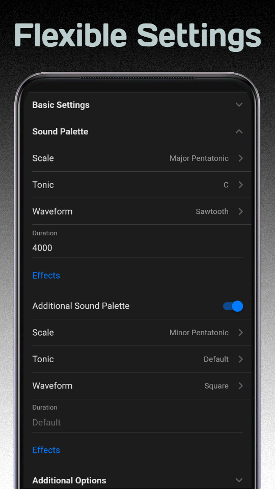 The Anti-Stress Music Pad allows you to configure up to two sound palettes, offering a wide range of options for sound personalization. Select scales, and tonality, adjust sound duration, and apply effects to create unique musical compositions. The variety of settings helps you achieve the perfect sound and create an atmosphere tailored specifically to you.