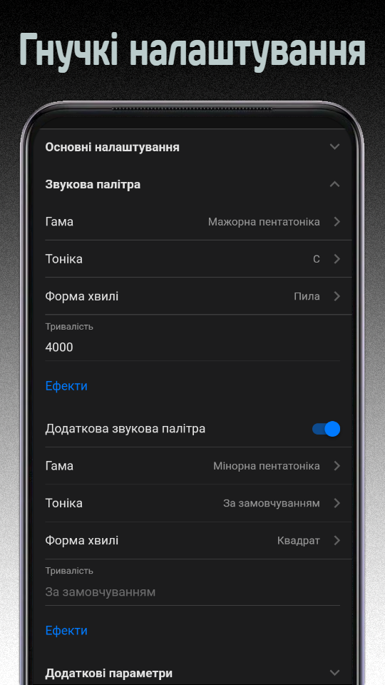 Музичний Антистрес Пед дозволяє налаштувати до двох звукових палітр, надаючи широкий вибір для персоналізації звуку. Оберіть гаму, тональність, налаштуйте тривалість звуків і застосуйте ефекти для створення унікальних музичних композицій. Варіативність налаштувань допомагає досягти ідеального звучання та створити атмосферу, що підходить саме вам.