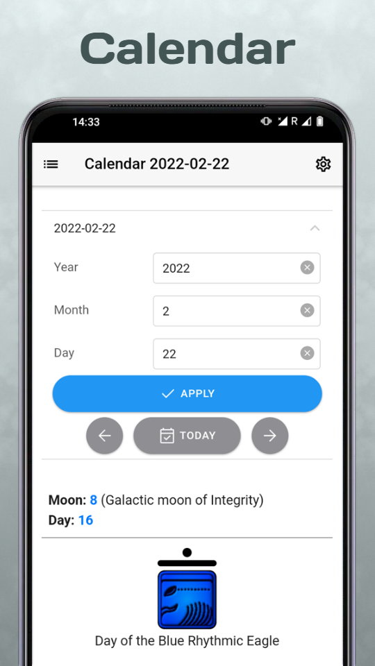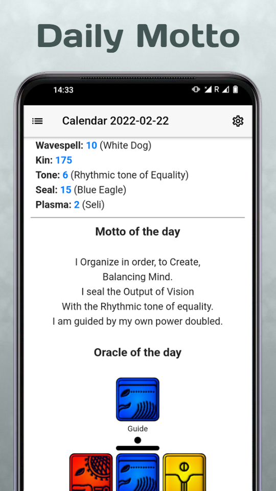 Each day in the Thirteen Moon calendar corresponds to one kin of the 260-element Tzolkin. Thus, each day has certain energy characteristics, represented by a pair of Galactic tone and Solar seal (frequency).