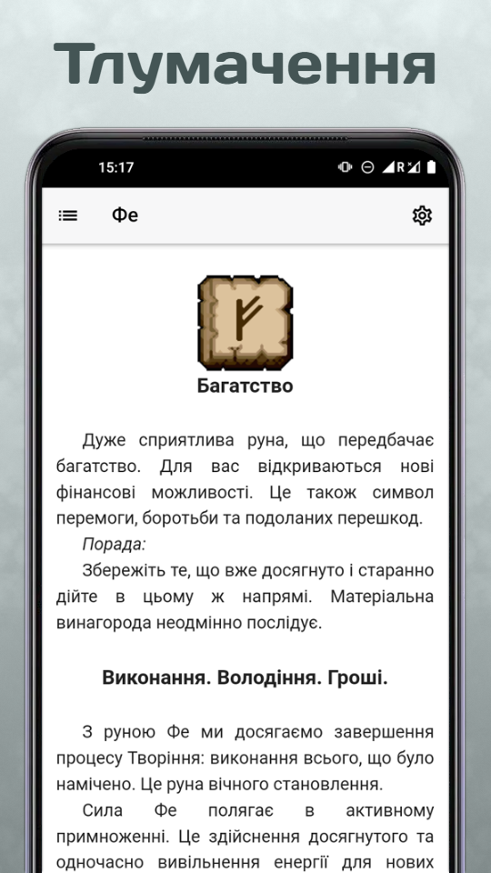 Кожна з 24 рун (плюс одна порожня) має свій символ, носій повідомлення, яке потрібно розкрити, щоб дізнатися відповідь.